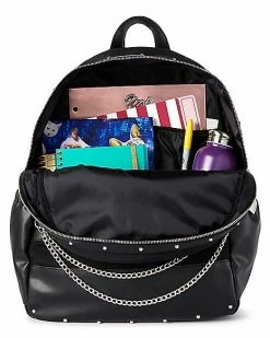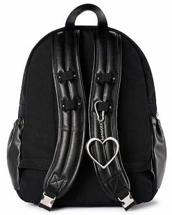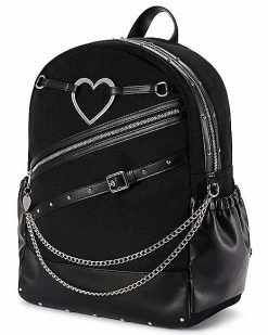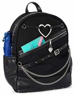 Meet the backpack of your dreams. This black backpack features silvertone hardware, including decorative chains and hearts. With pretty punk features, two roomy zipper pockets, two open faux leather side pockets, and a laptop sleeve, this backpack is down for any adventure.