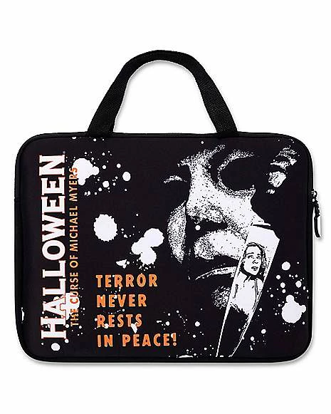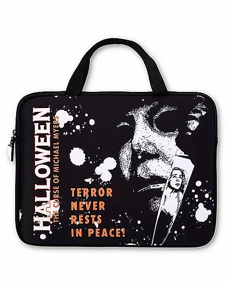 Represent your favorite horror movie series when you get this killer Halloween Laptop Sleeve! It features an image of Michael Myers and the legendary tagline, “Terror never rests in peace!”
